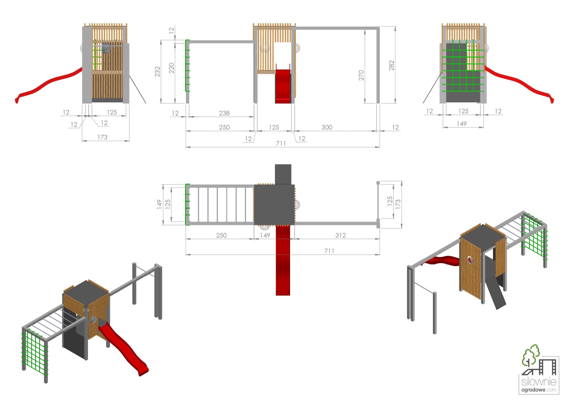 • Ewentualne akcesoria podpinane do haków jak bocianie gniazdo, huśtawki, liny, drabinki, wiszące drążki, trapezy są do ustalenia, można je zakupić we własnym zakresie lub wybrać z naszej oferty, a my przywieziemy w dniu montażu.