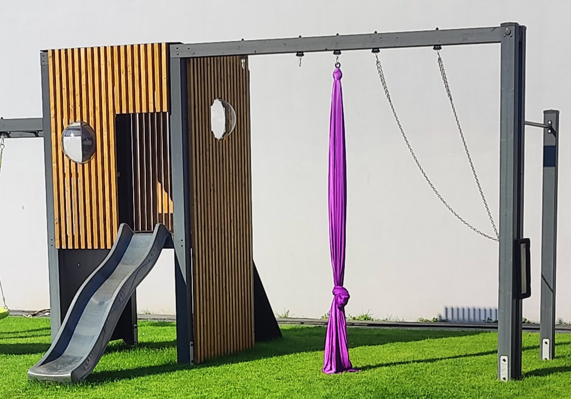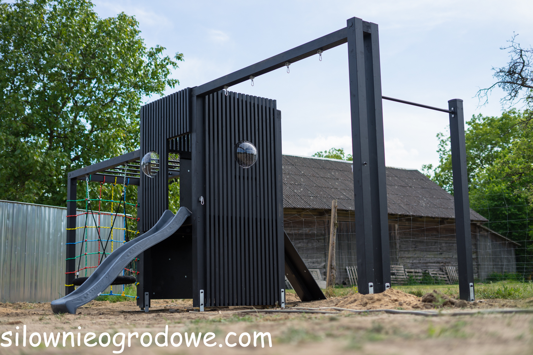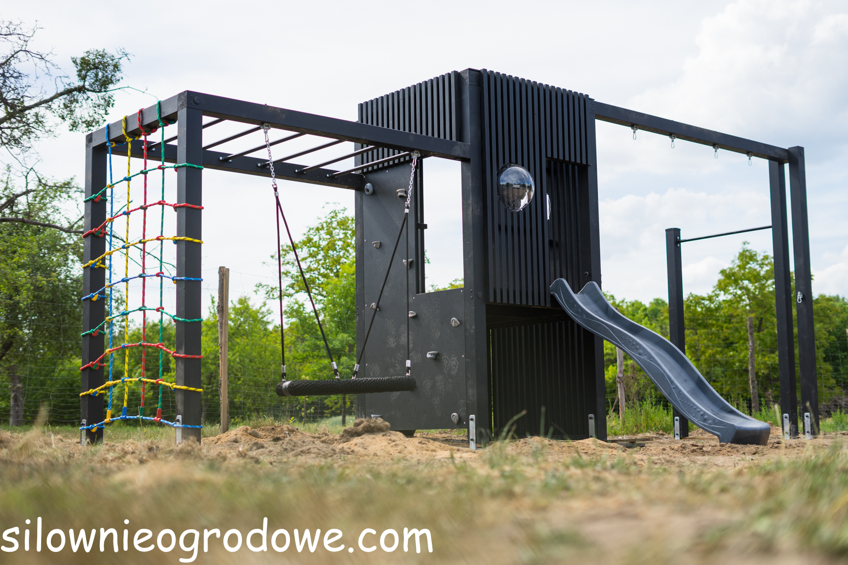Nowoczesny plac zabaw z lamelami, drabinkami, zjeżdżalnią i wysokimi huśtawkami – zestaw 34